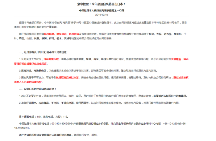 10日,中国驻日本大使馆发布台风“海贝思”相关紧急提醒,呼吁赴日游客及计划出行的中国公民要及时关注天气状况,提前调整行程,远离河道、海边及山区,以免遭遇洪水或山体滑坡等自然灾害。