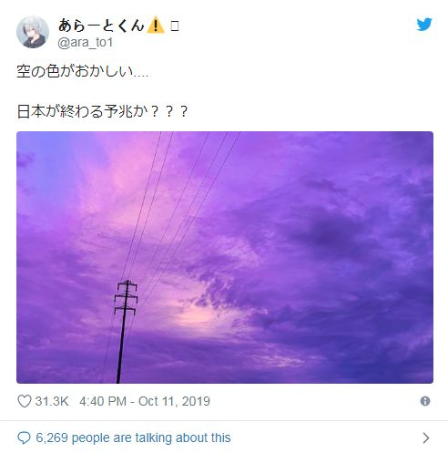11日傍晚,众多网友拍下了台风来临前东京天空呈现紫红色的景象▽