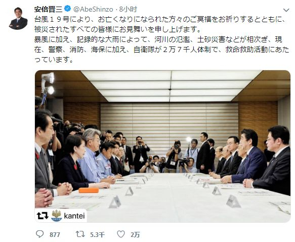 日本首相安倍晋三12日发表推文,向台风遇难者致哀,并表示,除警察、消防员外,约27000名自卫队军人也已投入救灾行动。