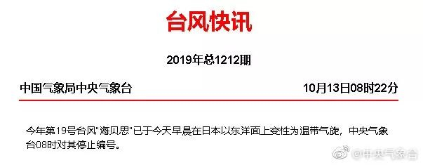 据最新消息显示,“海贝思”已于13日在日本以东洋面上变为温带气旋,中央气象台在早上8点对其停止编号。