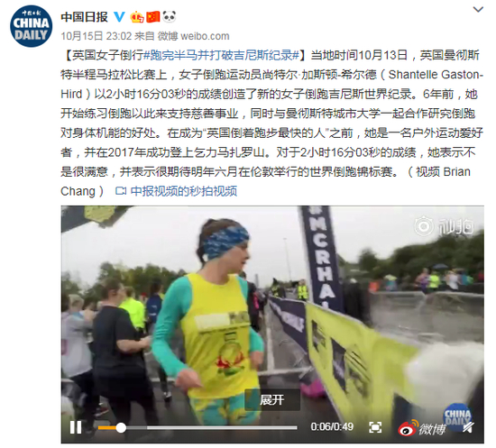 当地时间10月13日,英国曼彻斯特半程马拉松比赛上,女子倒跑运动员尚特尔·加斯顿-希尔德(Shantelle Gaston-Hird)以2小时16分03秒的成绩创造了新的女子倒跑吉尼斯世界纪录。6年前,她开始练习倒跑以此来支持慈善事业,同时与曼彻斯特城市大学一起合作研究倒跑对身体机能的好处。在成为“英国倒着跑步最快的人”之前,她是一名户外运动爱好者,并在2017年成功登上乞力马扎罗山。对于2小时16分03秒的成绩,她表示不是很满意,并表示很期待明年六月在伦敦举行的世界倒跑锦标赛。