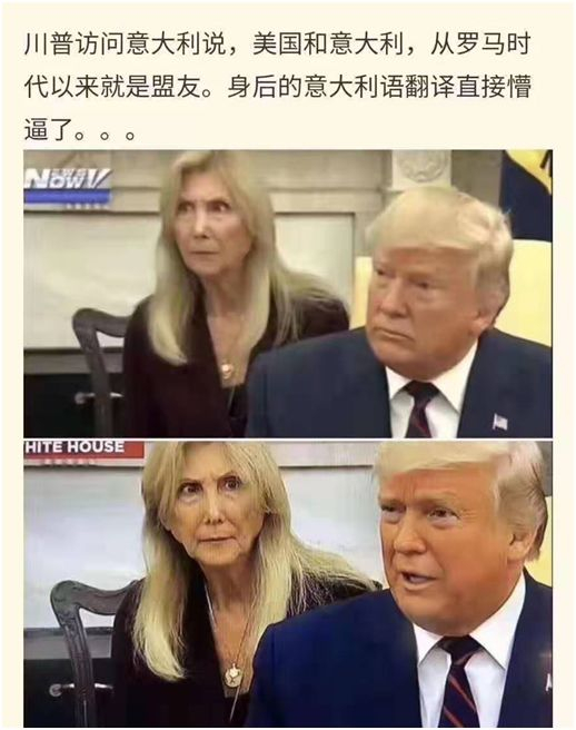 图片文字说,“美国总统特朗普访问意大利”时说“美国和意大利,从罗马时代以来就是盟友。”导致身后的女翻译表情“凝固”,“直接懵逼”。