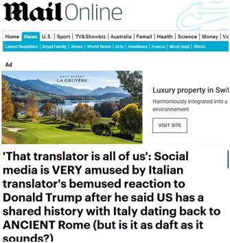 英国《每日邮报》:‘那个翻译的样子跟我们所有人一样’:社交媒体被意大利翻译员对特朗普的困惑反应逗乐了,因为他说美意历史可以上溯至古罗马(但这像听起来那么愚蠢吗?)