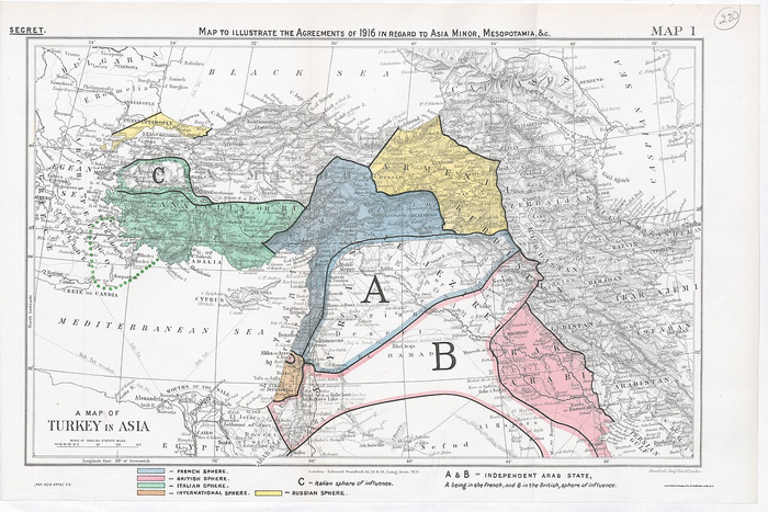 1916年5月16日,一战的中东地区战场胜负未分之时,英国、法国、俄罗斯之间签订了瓜分奥斯曼土耳其帝国的秘密协定。这份协定的草案是由英国的中东专家马克•赛克斯和法国外交官弗朗索瓦•皮科制定的,因此被称作《赛克斯-皮科协定》。按照协定,叙利亚、安那托利亚南部、伊拉克的摩苏尔地区划为法国的势力范围;叙利亚南部和美索不达米亚南部(现伊拉克大部分地区)为英国势力范围;黑海东南沿岸、博斯普鲁斯海峡、达达尼尔海峡两岸地区为俄罗斯势力范围。