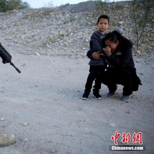 资料图:当地时间2019年7月22日,墨西哥华雷斯,一名危地马拉移民带着她的孩子在离美国边境只有几英尺远的地方,被一名墨西哥国民警卫队士兵拦住了,她捂着脸哭泣。