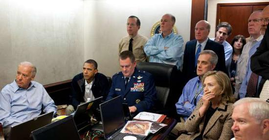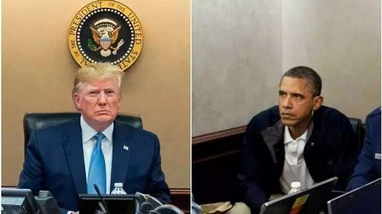 如果不告诉你照片的背景,你不会知道照片中的特朗普,正在全程关注一次重要的军事行动;而在奥巴马的照片中,每一位幕僚的表情,都像是一位各自领域的专家,正在紧盯着一次随时可能出现偏差,并造成美方人员伤亡的军事行动。