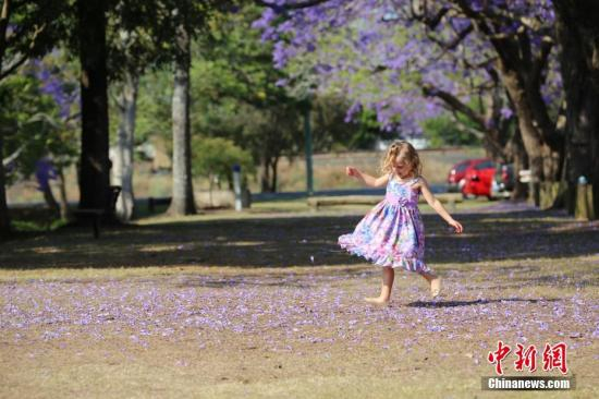 10月31日,小女孩在蓝花楹树下翩翩起舞。以蓝花楹闻名的澳大利亚新州北部小镇格拉夫顿(Grafton)正在举行第85届蓝花楹节(Jacaranda Festival),吸引了众多游客前来观赏游玩。中新社记者 陶社兰 摄