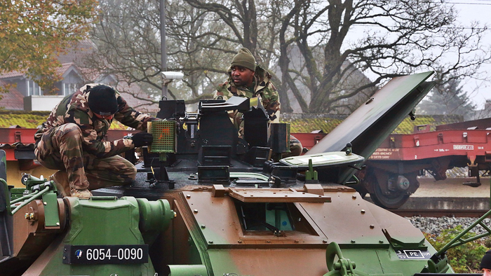 法国陆军第2装甲师501坦克团在德国霍恩费尔斯联合多国战备中心举行的“龙骑兵就绪”20训练中,正准备于11月1日在德国帕斯贝格火车站卸下勒克莱尔坦克和勒克莱尔DNG救援坦克。参加此次训练的还有美军的斯崔克装甲车部队。