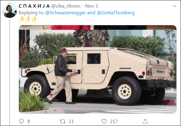 原标题:施瓦辛格与环保少女一起骑行,网友:你的悍马呢