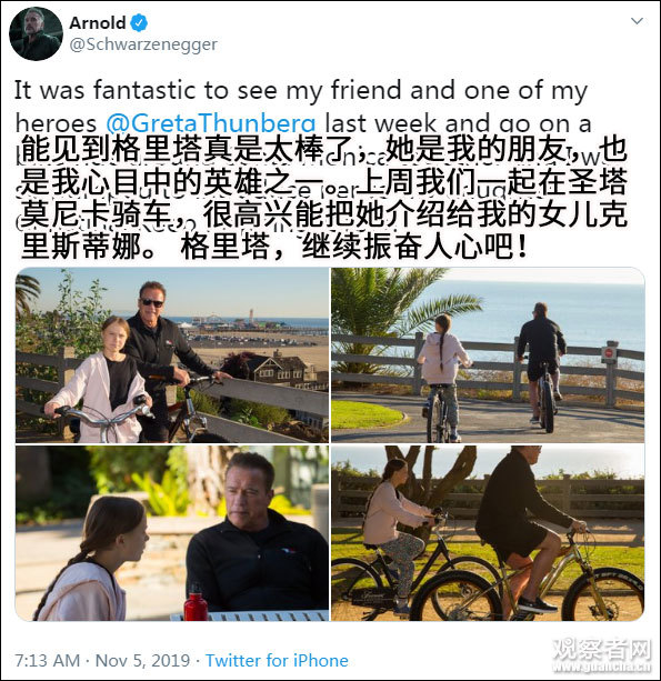 当天,施瓦辛格在社交媒体上发布了五张与格里塔一起在加州圣塔莫尼卡骑行的照片,在推文中,他称格里塔是自己的“朋友和英雄”,他已经介绍格里塔给自己的女儿认识,希望格里塔能继续“振奋人心”。