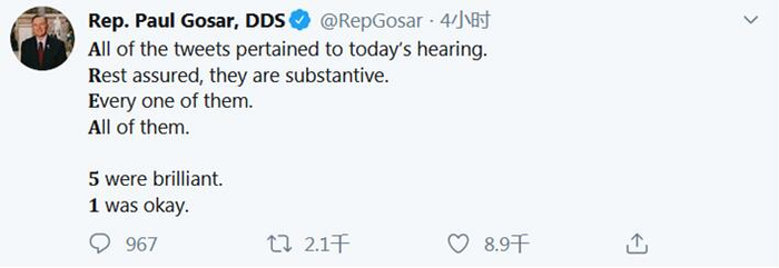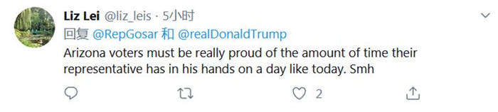 更有人讽刺他作为一名共和党议员,在当天举行弹劾总统调查听证会的日子里似乎有些“闲得慌”:“亚利桑那州选民一定为他们的代表在像今天这样的日子里拥有大量时间而感到非常自豪。” ↓
