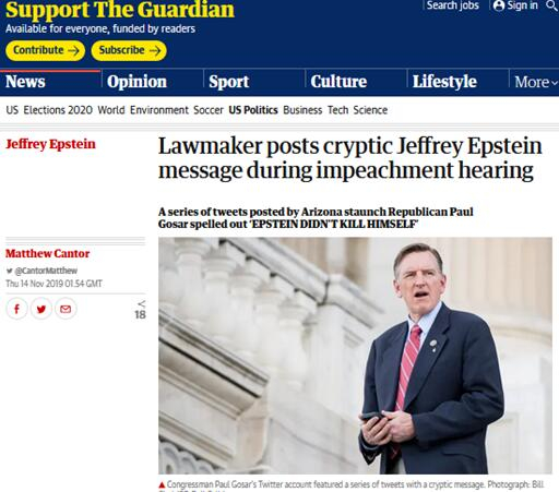 原标题:借抨击弹劾调查听证会之机,美共和党议员玩起“藏头诗”:“爱泼斯坦不是自杀”