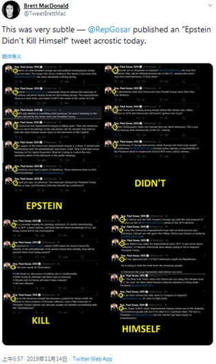 [环球网报道 记者 张晓雅]自美国亿万富翁杰弗里·爱泼斯坦狱中之死被法医裁定为自杀以来,对这一结论的质疑声一直不断。多家外媒报道称,当地时间11月13日,美国国会正举行针对弹劾总统调查的首次听证会,一位共和党议员却以抨击民主党发起弹劾调查为主要内容的23条推文,将对爱泼斯坦之死的表态以一个古老而神秘的方式--“藏头诗”表达了出来:爱泼斯坦不是自杀。
