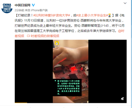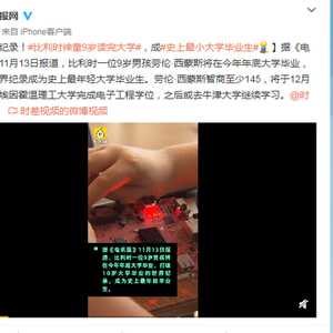 据《电讯报》11月13日报道,比利时一位9岁男孩劳伦·西蒙斯将在今年年底大学毕业,打破世界纪录成为史上最年轻大学毕业生。劳伦·西蒙斯智商至少145,将于12月在荷兰埃因霍温理工大学完成电子工程学位,之后或去牛津大学继续学习。