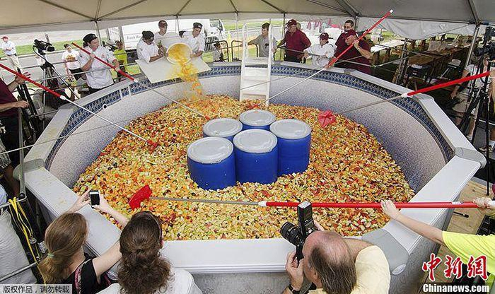 资料图:当地时间2015年9月2日,美国麻省理工学院动员大约500名师生,制造出一份重15000磅(约6803公斤)的超大份水果沙拉,打破吉尼斯世界纪录。
