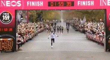 肯尼亚男子基普乔格以1时59分40秒的成绩跑完马拉松全程。图片截自基普乔格社交媒体。