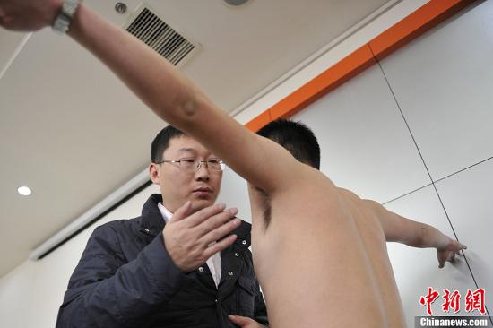 资料图:航空公司招聘人员在检查应聘男子腋下有无狐臭。中新社发 韦亮 摄