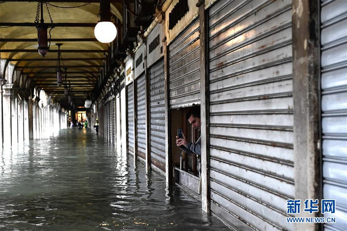 这是11月15日在意大利威尼斯拍摄的因洪水侵袭而关门的店铺。新华社发(阿尔贝托·林格里亚摄)