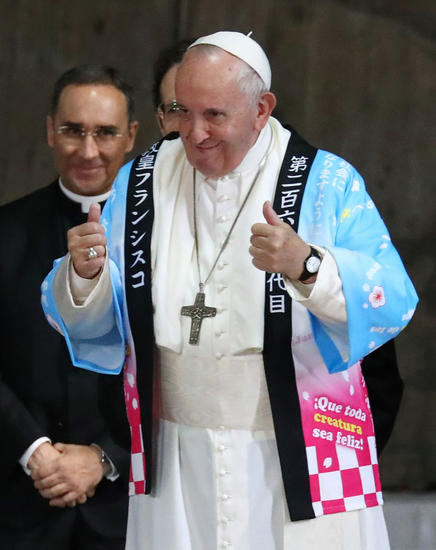 《朝日新闻》介绍,教皇25日中午在东京圣玛利亚主教座堂参加“与青年集会”的活动。期间,由日本青年天主教徒组成的民间团体为他献上一件日式传统短褂作为礼物。