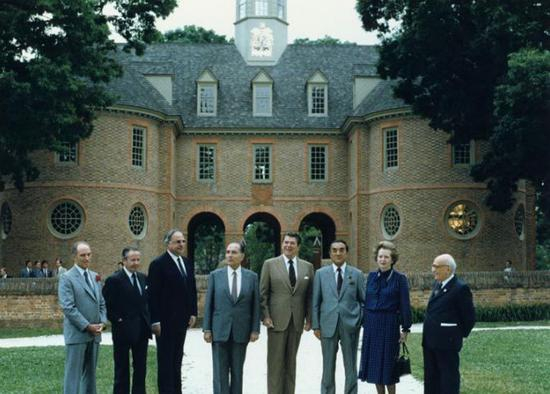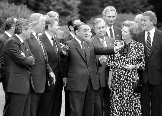 右三为中曾根,站在里根和撒切尔夫人中间。