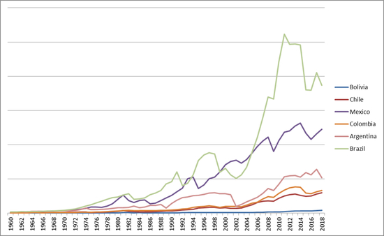 (1960-2018年南美洲主要国家GDP增长情况对比 数据来源:世界银行)