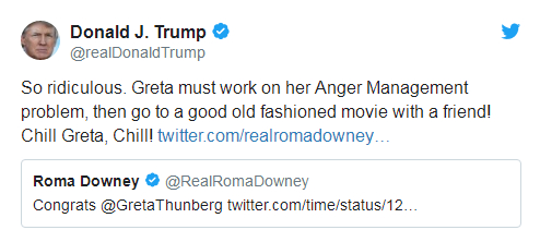 特朗普因此不满,并于12日直斥,“真荒谬!格蕾塔必须先解决她的愤怒处理问题,然后和朋友一起去看一部老式电影!”