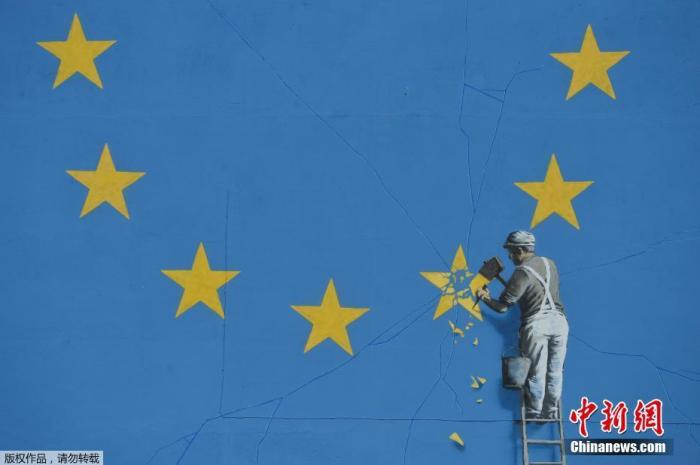 资料图:当地时间2017年5月7日,英国多佛,一名街头艺术家班克西创作了一幅画,画面中一名工人正从欧盟12星旗帜上抹掉一颗星,寓意着英国将脱离欧盟。