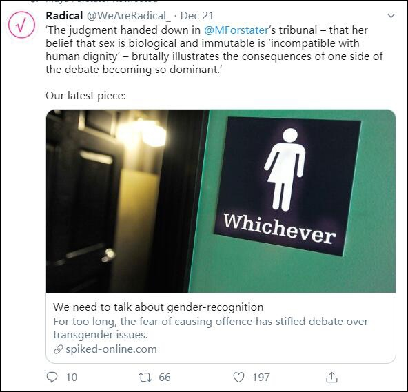 按照仲裁庭的说法,不承认跨性别=不值得尊重。据经济学人报道,一名商人Harry Miller转发了一首嘲笑跨性别者的诗后,立刻接到了当地警察的电话,希望他“好好审视一下自己的想法”。