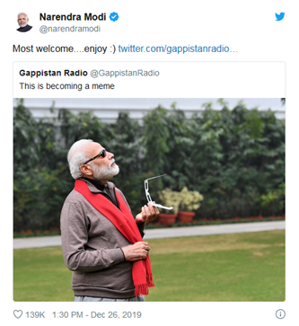 有网友表示,莫迪的照片“正在成为表情包”,而莫迪本人也回复称:“热烈欢迎……享受吧!”