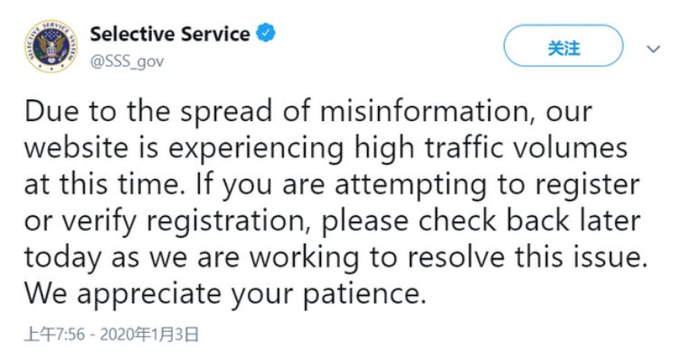 美国兵役登记局发推:“由于假消息流传,我们网站目前出现高流量。若您要进行登记或查询,请稍后再尝试。”
