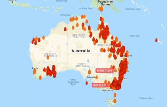 1月5日的澳大利亚山火实时情况,红色为燃烧12小时内的火灾,橙色为燃烧12-24小时的火灾图/Google Crisismap