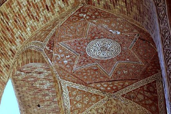 从东面入口进入庭院,西面建筑的伊万门有着萨法维风格的装饰,上面可以看到完美符合几何造型的马赛克图案;南面建筑的伊万门则有蒙古特色的马赛克花纹以及棱角分明的装饰线条;北面的伊万门则是典型的塞尔柱克风格,后面祈祷大厅内的石柱、穹顶和蜂窝状藻井均由泥砖建成,非常朴素。