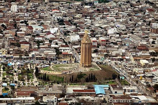这座巨大的砖制陵墓高塔位于伊朗东北部戈勒斯坦省的贡巴德•卡武斯市市中心,是伊朗最精致的古迹之一。塔身呈十边形,塔顶为圆锥形,塔高70米(包括底座高度),塔身净高53米,是全世界最高的砖塔。