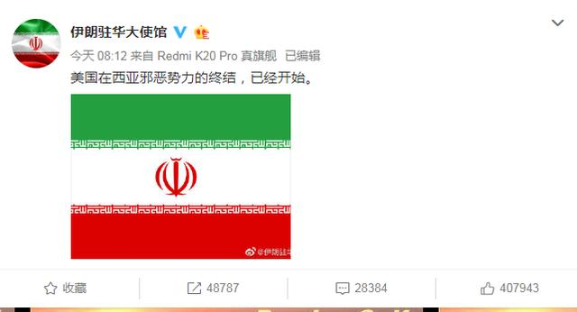 这两天,随着美伊冲突占据新闻头条,伊朗驻华使馆的官方微博成为一大网络热点。原本只有几万粉丝的伊朗驻华使馆微博,粉丝数截至1月8日17时50分已暴增至近16万。其中一条1月8日上午与伊朗发动袭击几乎同时发布的微博,转发数已接近5万,点赞超过40万。伊朗驻华大使克沙瓦尔兹扎德这两天也频频接受中国媒体采访,表达伊朗官方的强硬立场。华黎明认为,这体现了紧张局势下伊朗方面对舆论话语权的重视。