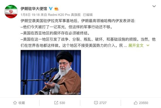 1月8日上午,也就是伊朗袭击美军基地后不久,伊朗驻华大使馆在官方微博上晒出国旗,并配文“美国在西亚邪恶势力的终结,已经开始”。截至目前,这条微博点赞数超过50万。