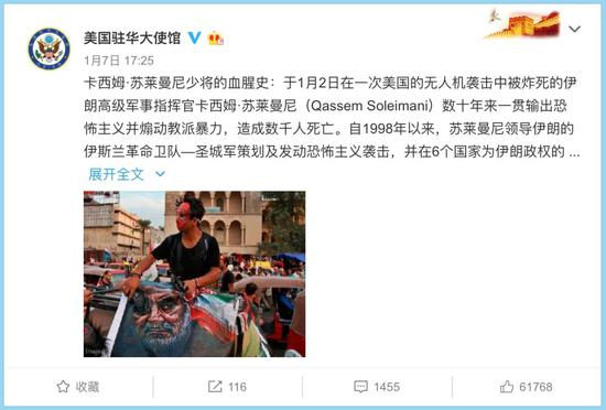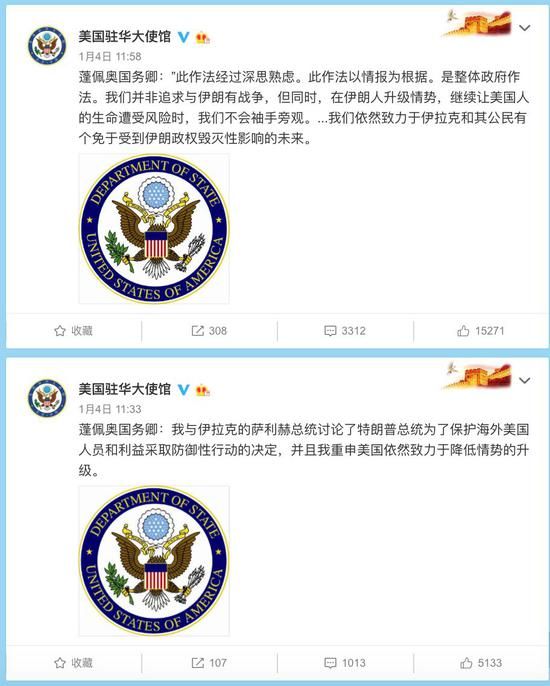之后不久,美国驻华大使馆在一个小时内连发三条微博,并在文中引用了美国国务卿蓬佩奥的话,声称消灭苏莱曼尼是为了保护海外美国人的“决定性防御行动”。