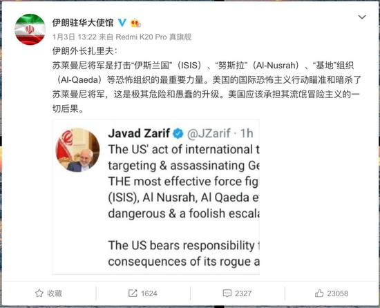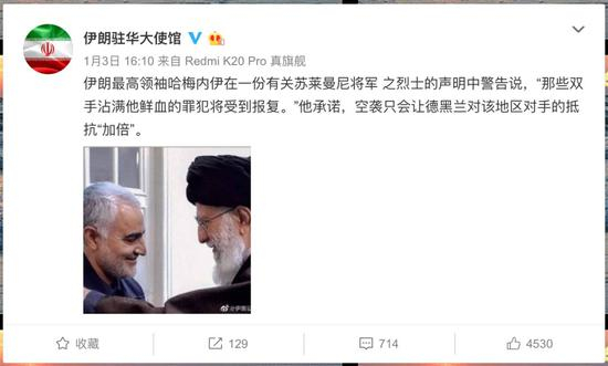1月3日,伊朗伊斯兰革命卫队下属“圣城旅”指挥官苏莱曼尼在伊拉克巴格达国际机场外遭美军空袭身亡,伊朗驻华大使馆迅速发布了两条微博,分别引用伊朗最高领袖哈梅内伊和外长扎里夫的话,警告美国将遭到“报复”。