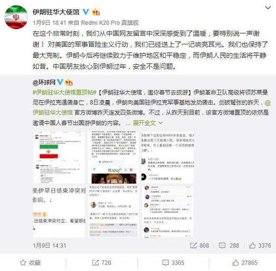 1月9日傍晚,伊朗驻华大使馆对中国网友表示感谢:“在这个非常时刻,我们从中国网友留言中深深感受到了温暖,要特别说一声谢谢!对美国的军事冒险主义行动,我们已经送上了一记响亮耳光。我们也保持了最大克制。伊朗今后将继续致力于维护地区和平稳定,而伊朗人民的生活将平静如昔。中国朋友放心到伊朗过年,安全不是问题。”