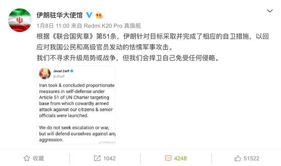 8日这一天,伊朗驻华大使馆先后发布四条微博,发布伊朗伊斯兰革命卫队的声明,称为之前遇袭身亡的将领复仇,炸了美军基地,同时还根据《联合国宪章》中的相关条款,称这是不寻求战争的自卫行动。