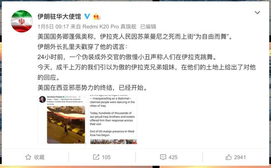 对此,伊朗驻华大使馆又在北京时间1月5日发文进行反驳。在这条微博中,就提到了“美国在西亚邪恶势力的终结,已经开始。”