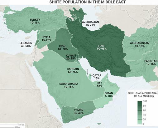 中东各国什叶派人口的分布,绿色程度越深,什叶派人口比重越大