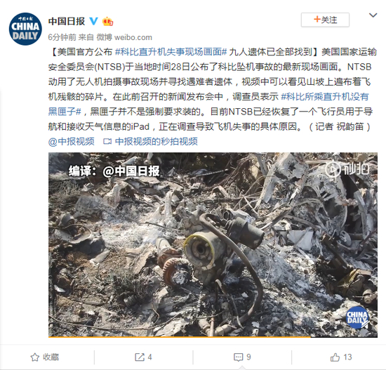 原标题:美国官方公布 #科比直升机失事现场画面# 九人遗体已全部找到