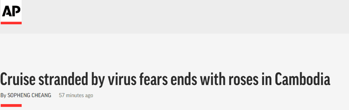 据介绍,载有2000多游客的“威士特丹”号邮轮,1月16日从新加坡出发,停靠东南亚多个港口后到达中国香港。在接上新乘客后,邮轮2月1日从中国香港出发,但由于担心新冠病毒传染,该船被至少5个国家或地区的港口拒之门外。