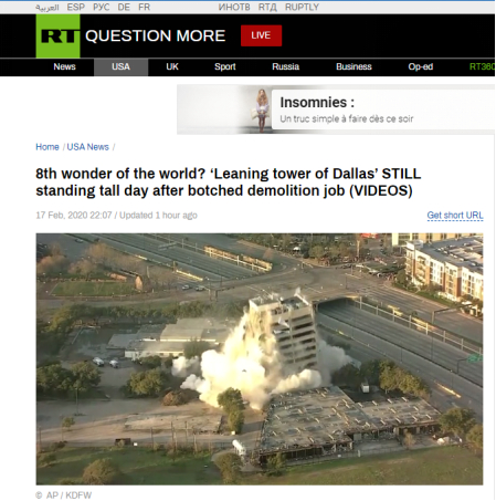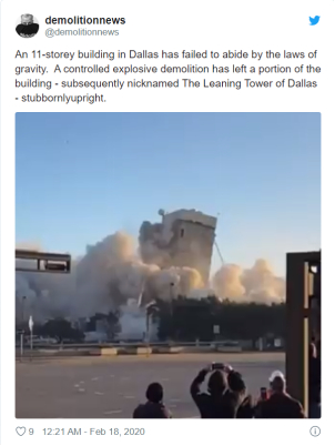 “达拉斯一座11层的建筑未能遵循地心引力定律。经控爆拆除后,楼的部分建筑顽固直立着,后来也被戏称为‘达拉斯斜塔’。”