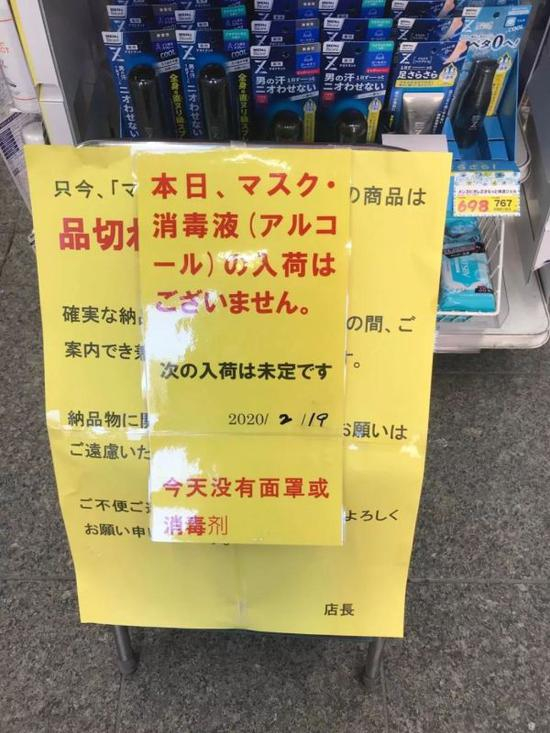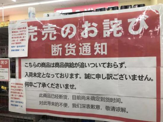 原因呢,是他们压根买不到口罩。各大商场和连锁便利店的口罩柜台都张贴着一张纸“入荷未定”,也就是不知道什么时候才能进货。
