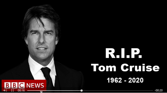 该账号3个小时之前就发布了一则视频,长度35秒,视频开头是“英国广播公司(BBC NEWS)突发消息”片头,接着女主持人仅说了一句“我们得到来自美国的消息”,视频就插入了一张“汤姆·克鲁斯,1962-2020,愿逝者安息”的黑白图片,直至结束。