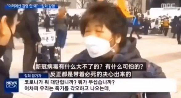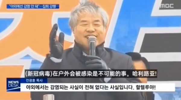 发起这次集会的全光勋牧师说:“各位战胜文在寅和朴元淳的镇压来到集会,是因为主为大家祈祷,反而得的病也痊愈了。”接着他又说:“你们中间有人染上病毒吗?下周都来礼拜吧,主会给你治愈。即使不被治愈也没关系,我们的目的地是天堂,我们是战胜死亡的人。”