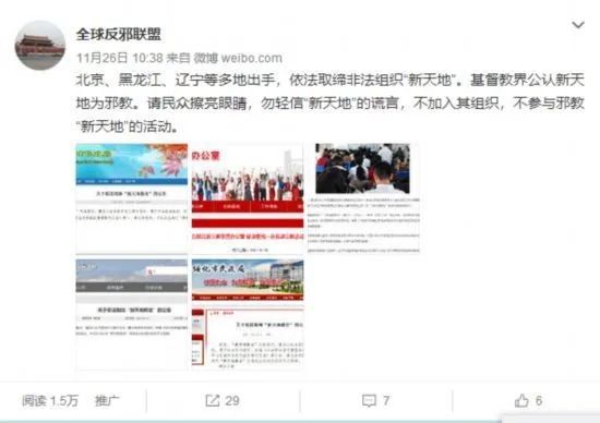 不过,中国警方早就和韩国方面取得联系,得知新天地教会的邪教性质,将其列入“邪教名单”,并多次打击新天地教会在中国的非法分支机构。