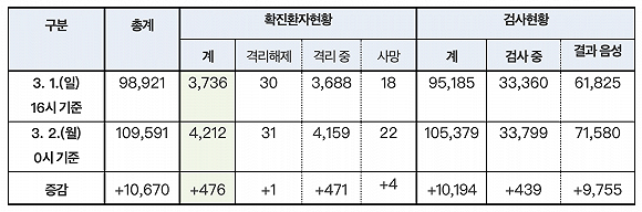 韩国中央防疫对策本部3月2日通报,截至当天0时,韩国较昨日下午4时新增476例新冠病毒感染病例,累计确诊4212例,死亡增至22例,治愈增至31例。该国疫情信息发布改为每日一次。