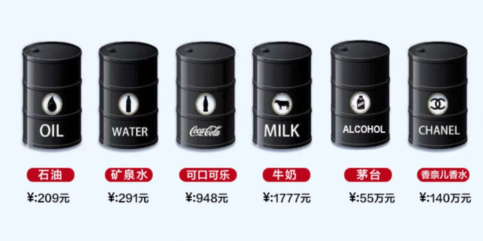有人将油价与水价做对比,发现一桶原油按30美元计折合人民币约209元,同样容量的农夫山泉售价却接近300元。